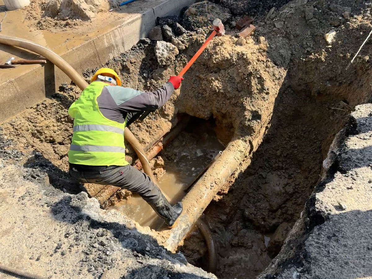 “先從這里開挖!”現(xiàn)場指揮一聲令下,打樁機轟鳴作響,人工開挖同步進行。第一個作業(yè)坑(2×3×2米)在井蓋旁逐漸成型。抽水泵開足馬力,坑內(nèi)積水被不斷排出。然而,當水位下降后,搶修人員卻發(fā)現(xiàn)漏損管道不在這里。憑借多年的經(jīng)驗和細致觀察,搶修人員根據(jù)水流方向判斷,漏損管道應(yīng)在后方6米處。沒有猶豫,沒有抱怨,第二個更大的作業(yè)坑(5×4×2.3米)開始挖掘。