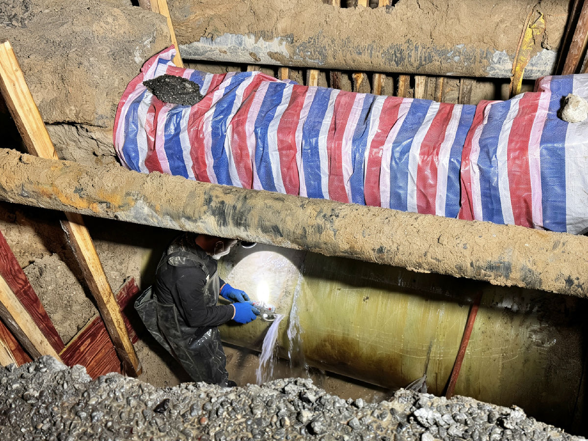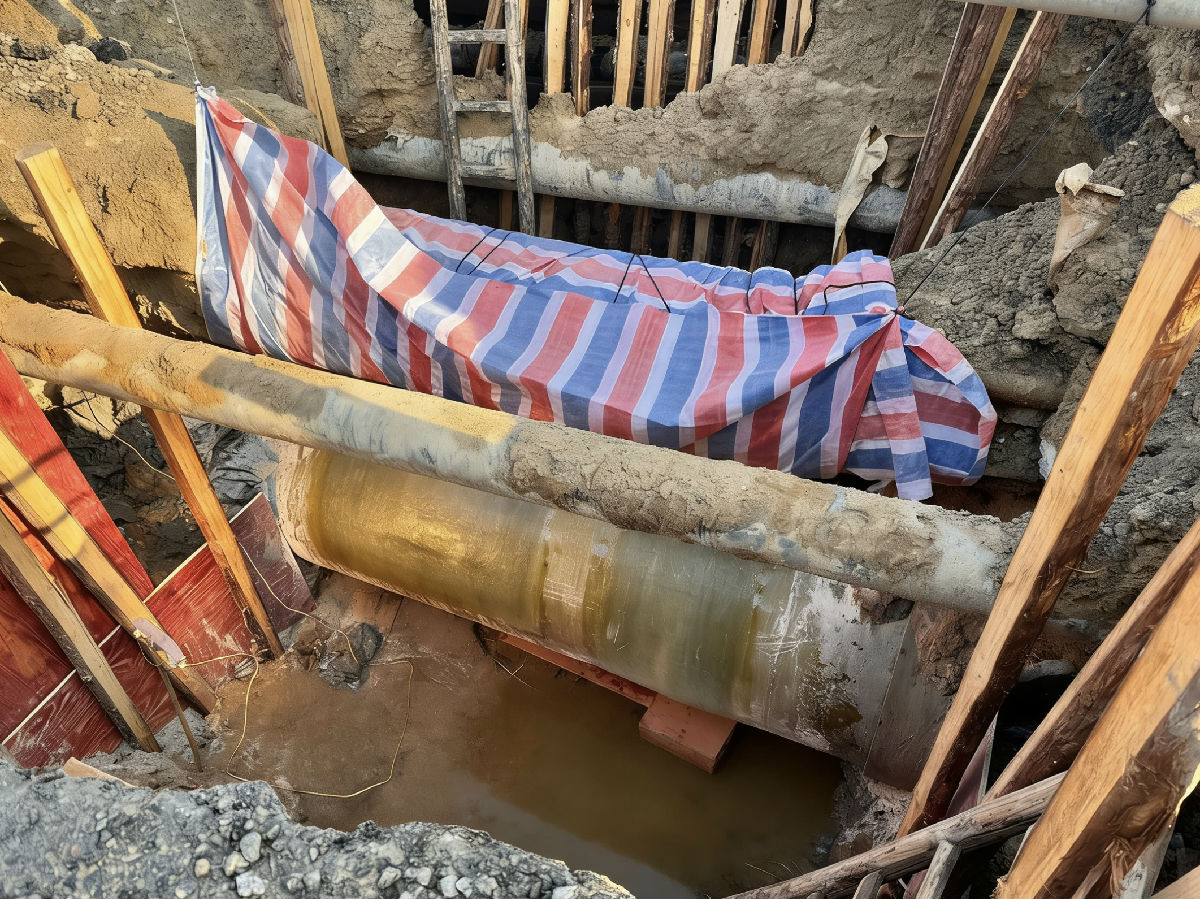 下午時分,漏點終于現(xiàn)身。在三米深的坑底,一根DN1000玻璃鋼管的側(cè)方和下方,出現(xiàn)了兩處破損。