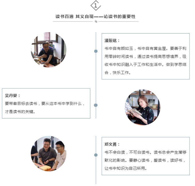 集團(tuán)公司黨委副書記、紀(jì)委書記、工會(huì)主席潘振銘,黨委委員、總會(huì)計(jì)師吳丹嬰,黨委委員、總工程師鄭文勇與干部職工共聚一堂分享讀書心得。